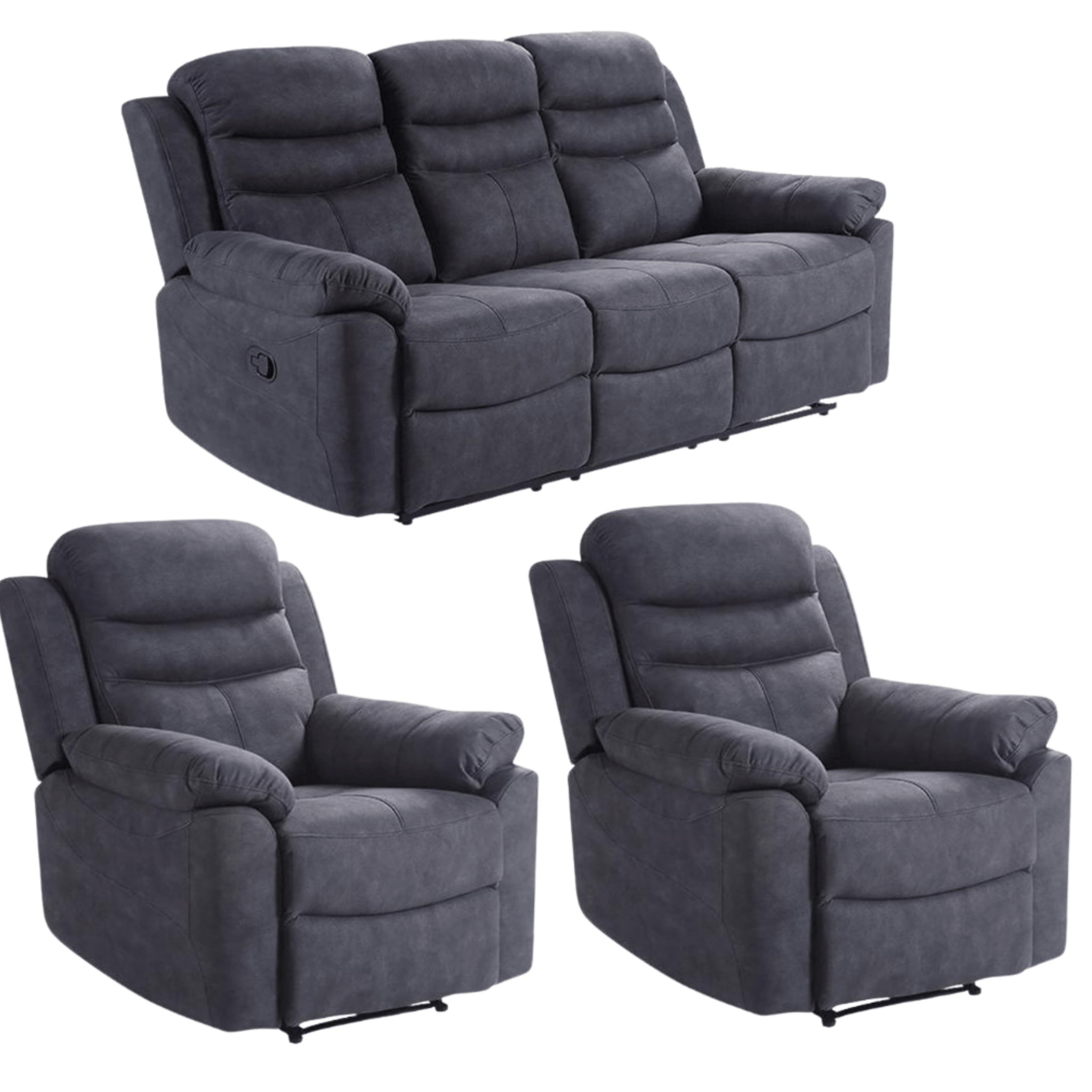Each piece comes with a manual recliner function, so you can sit back and relax with ease. With padded cushions, supportive backs, and sturdy armrests, this set is designed for everyday comfort. A strong frame makes it reliable and long-lasting for family use.