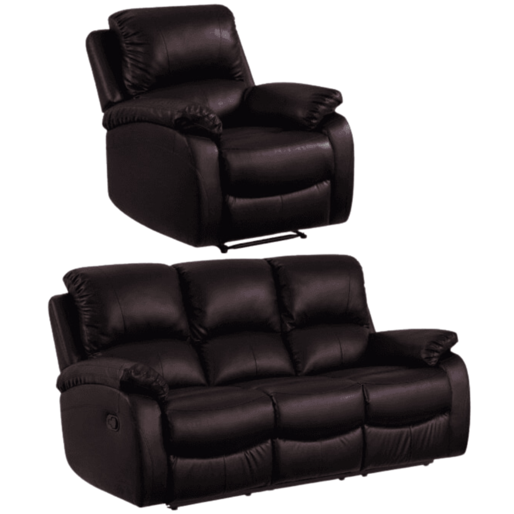This set includes a spacious three-seater recliner sofa and a matching single recliner armchair. Both feature a simple manual recliner mechanism. At the pull of a handle, you can sit back, recline, and relax. This setup gives you flexible seating for family living, quiet evenings, or entertaining guests.