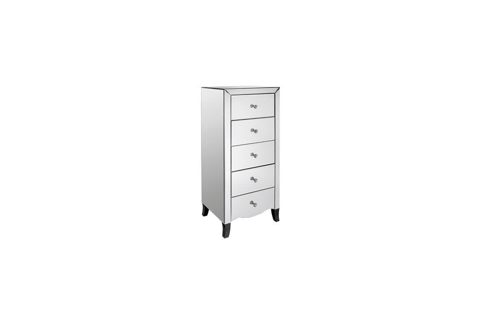 Adding light and whimsical beauty has never been easier with the introduction of the Valentina 5 Drawer Chest. Comprised of 5 drawers in equal sizes the crystal effect handles and matching mirrored carcass and top, rest elegantly on black bowed legs. Reflecting light around any space this classically shaped piece of furniture is perfect for bringing on-trend glamour into your living space.